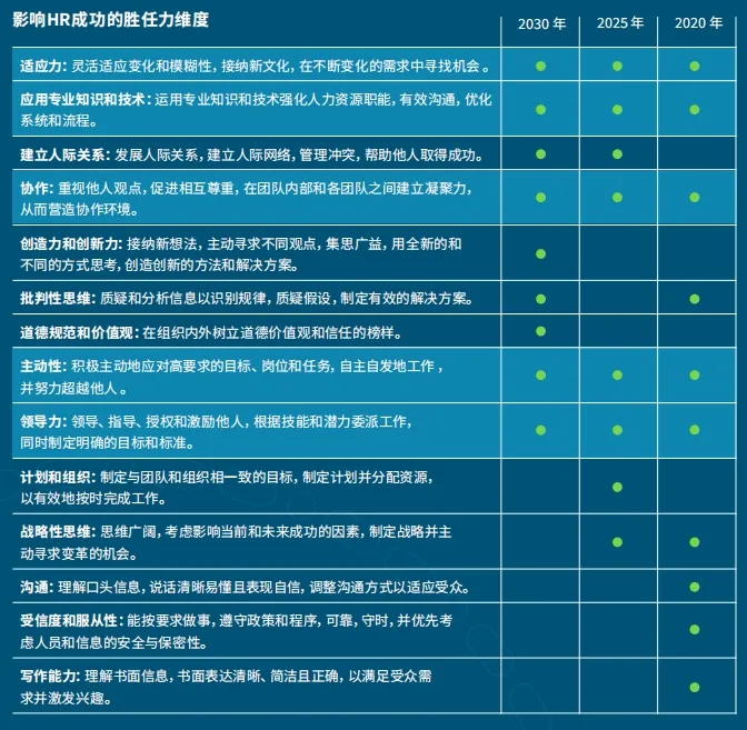 我们通过 SHL 全方位胜任力模型,将人力资源重点领域与取得成功所需的胜任力进行映射。下表显示了三个时间段内每项胜任力是否为促进成功的关键领域,并附有简要说明,以显示胜任力的重要性有所提高或降低。浅蓝底色标记的五项胜任力在整个十年内(2020-2030 年)均保持高重要性 。