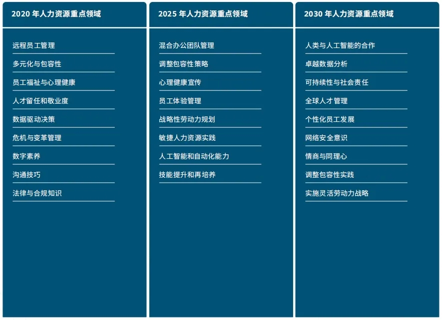 下表显示了各项技能在不同时间段所发生的演变。加粗字所显示的五项技能经久不衰,从2020年到今天,乃至未来,对于HR从业者而言始终处于关键位置。