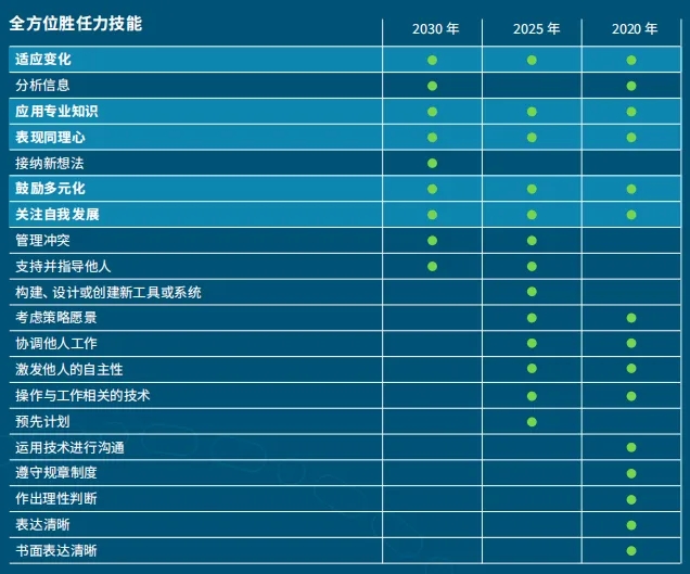 新冠疫情导致的全球不确定性、波谲云诡的政治局势和科学技术的飞速发展,尤其是人工智能领域的快速进步,迫使组织陷入变革的漩涡之中。2020年企业需要即时危机管理技能,而2025年和2030年则聚焦于更具战略性且面向未来的技能。