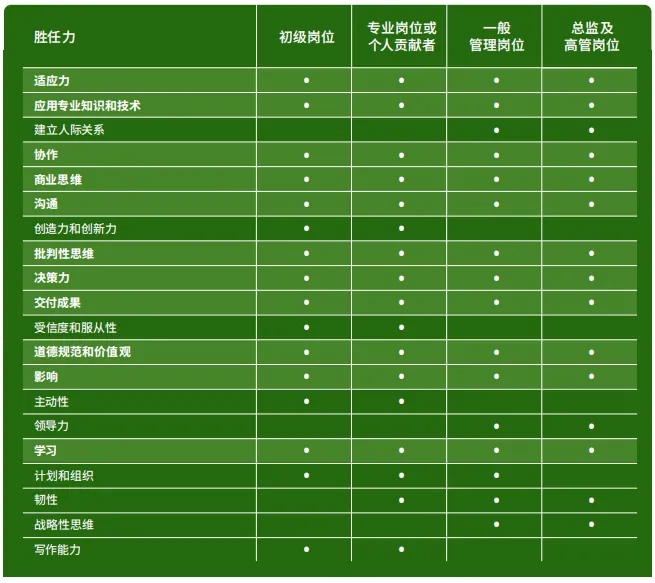 某些技能会随着岗位责任的增加而发展,例如: 在管理级别岗位上更强调“领导力”和“战略性思维”。与这些针对特定职级的人才技能相比,基础胜任力则是那些要求所有人力资源岗位从业者掌握并重视的胜任力。