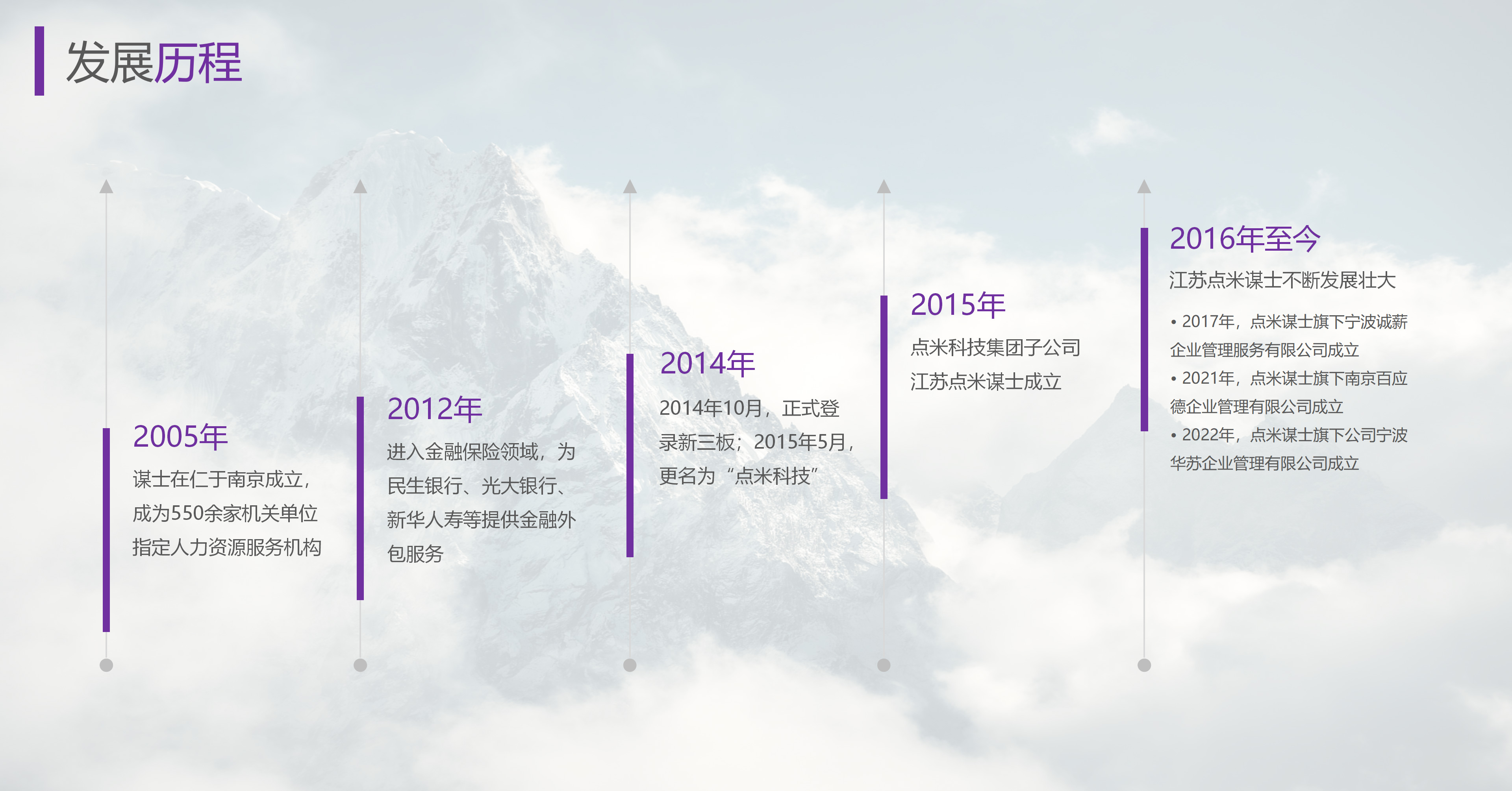 从2005年成立以来,点米谋士便深耕人力资源服务,是一家坚持理念和践行使命的公司,奉行着帮助政府、帮助企业、帮助个人的三帮经营理念。从2016年开始,点米谋士不断发展壮大。2017年,点米谋士旗下宁波诚薪企业管理服务有限公司成立;2021年,点米谋士旗下南京百应德企业管理有限公司成立;2022年,点米谋士旗下公司宁波华苏企业管理有限公司成立。