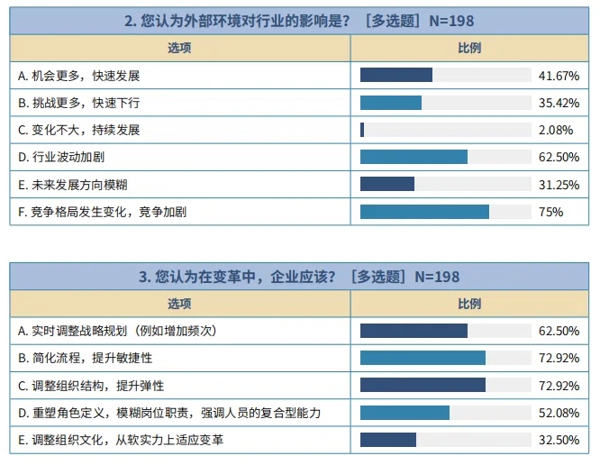 75%的选择反映出变革背景下的环境变化加剧了行业竞争。这展示了组织面临的外部环境的动荡。在变革中,72.92%的企业认为应该“简化流程,提升敏捷性”,这反映出变革环境下,企业内部面临流程和效率瓶颈,需要简化和优化。同样比例的人选择了“调整组织结构,提升弹性”。这体现出环境变化给原有组织结构带来的压力,需要进行适应性调整。62.5%的企业选择“实时调整战略规划”。这显示出企业面临更新战略部署的需求,跟上环境变化步伐。也有超过半数的企业选择“重塑角色定义”,这与结构调整相呼应,原有角色边界需要重新考量。